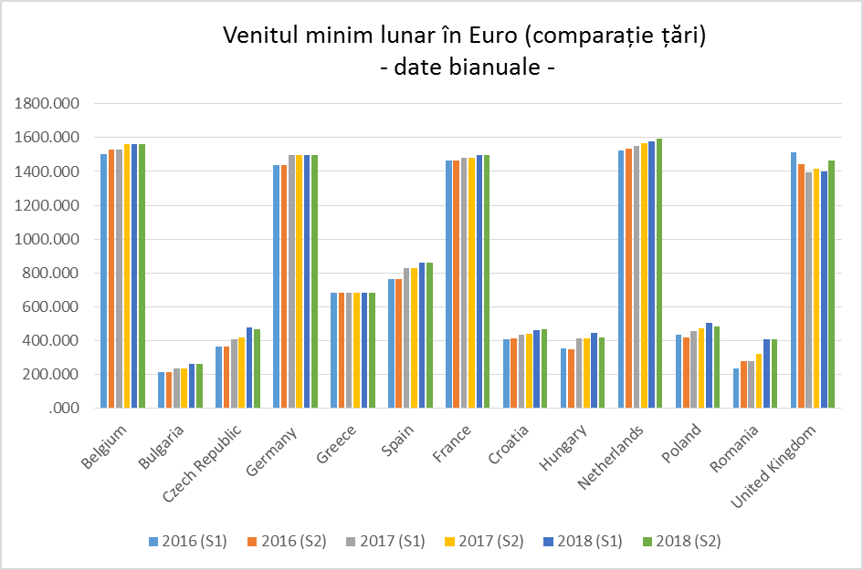 Fig. 1. Venitul minim lunar în euro, date bianuale. Sursa: Eurostat (variabila earn_mw_avgr2)